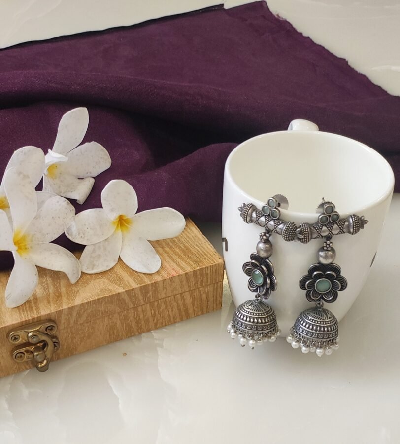 retty, polished and statement worthy! This earring is crafted in oxidized German Silver featuring a bold blue stone. This statement earring is perfect for your straight kurta look or even your denim looks.
