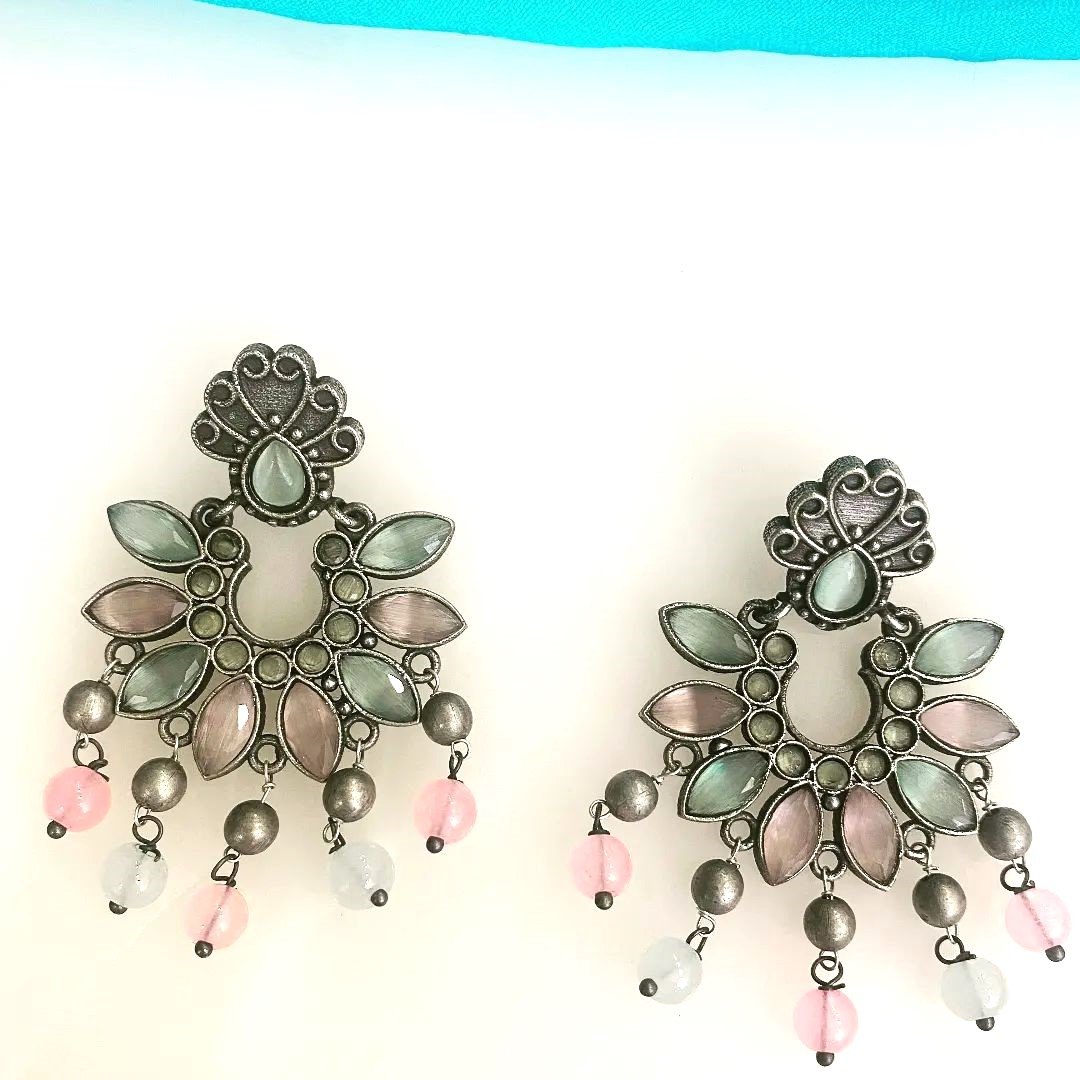 A pretty pair of earrings that are hard to resist. The pearl drops adds an instant dash of royalty to your looks. Crafted in oxidised silver, these earrings features floral designs with stones studded.