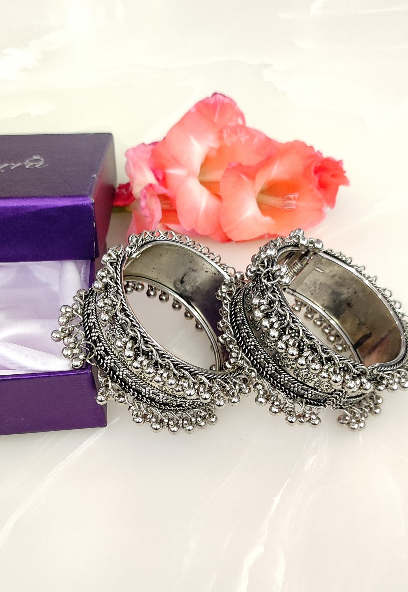 Crafted in German silver and finished with silver oxidised, this bangle is an extremely wearable piece of jewellery you’d want to dress your wrists with on daily basis. It is interconnected with each element and surrounded by the ghungroos which adds it’s beauty and makes it an easy, to style piece that looks wonderful by itself and gives a statement look.