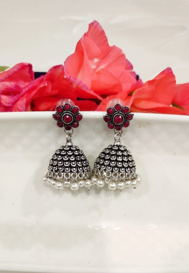 Indian dressing is incomplete without iconic jhumkis! Taking the same trend-forward, this Silver Oxidised Jhumki will justify your occasion-specific dressing as well as your simple kurtas! It features intricate circular motifs on the dome with beautiful maroon stones studded in the center. These pair of earrings are lightweight and will add the right dose of drama to the look.