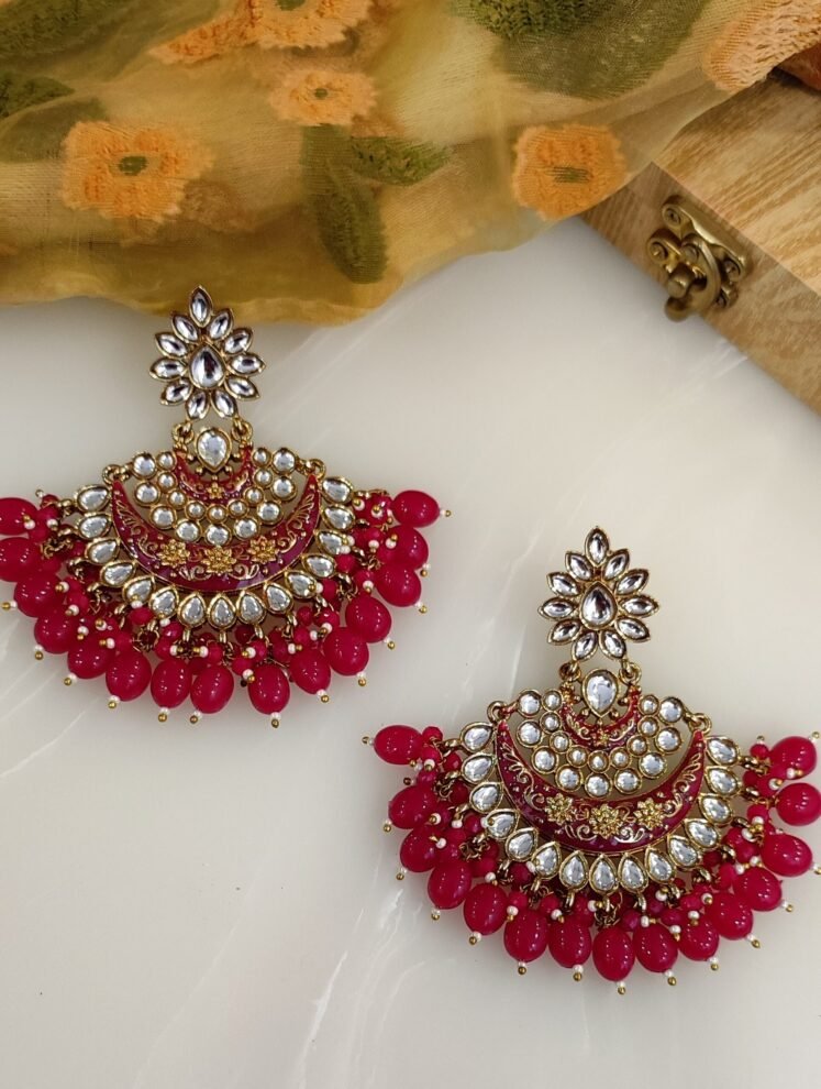 Traditional Chandbali earrings with a priceless charm and unique embellishment of stones, crystals and pearl. Exquisite in beauty and elegance, this piece is just the right choice for every traditional outfit.