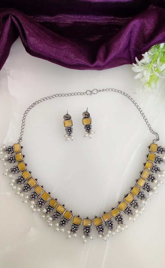 This choker necklace frames the face to perfection! The necklace is crafted in oxidized silver that features grey stones studded with pearl drops paired with matching earrings. This set will give you all the royal feels and dress you up in an instant. Style this up with your silk sarees for a rich festive look!